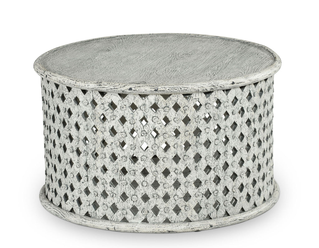 Hand-crafted wood-carved Cocktail Table in an aged alabaster finish, Samir features a transitional design that works whether your tastes are farmhouse or traditional. The round table dimensions fit well with Sectional Upholstery or Sofa Sets and feature a latticework base that adds interest to any room.