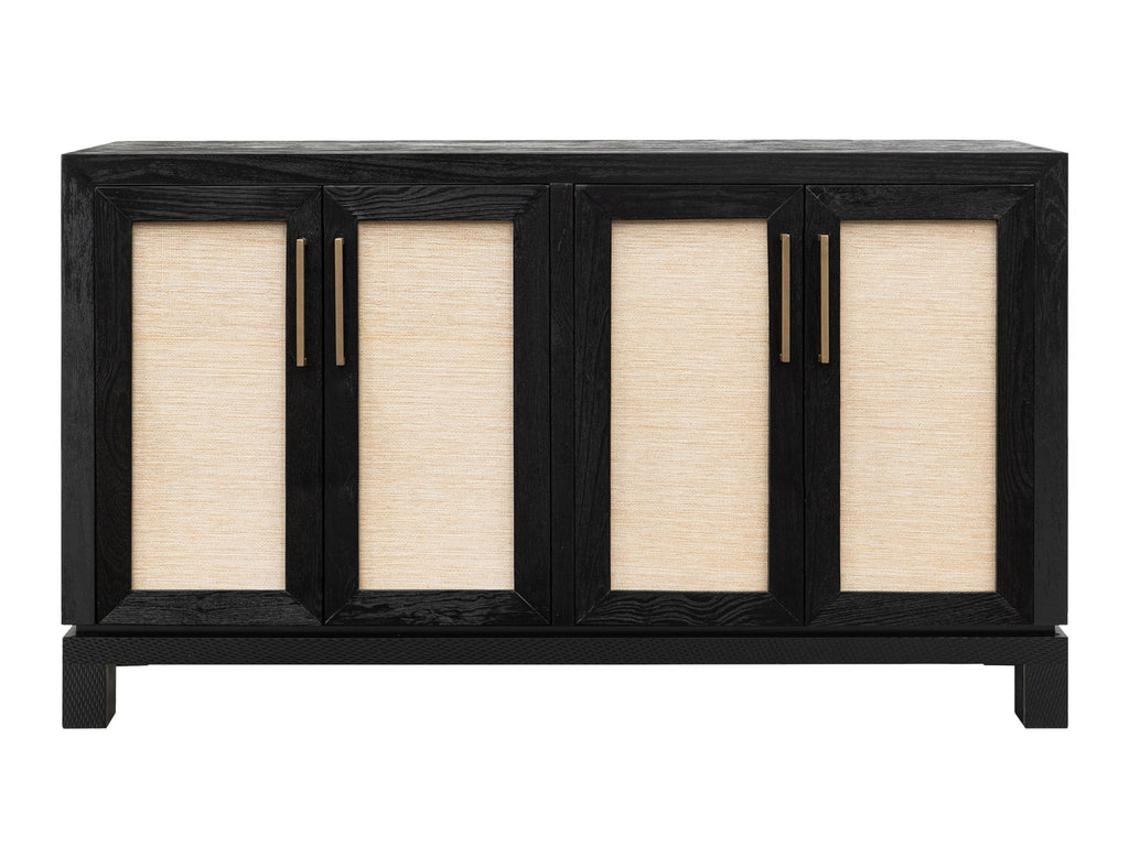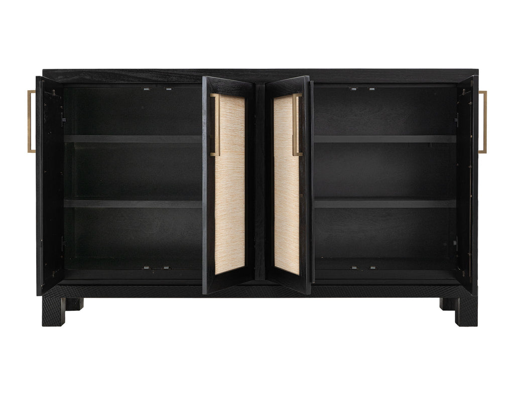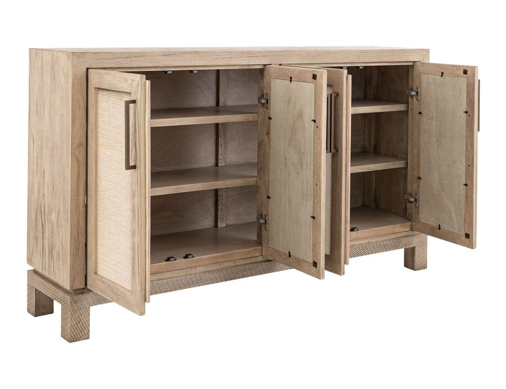 4 Door, Console. Bring warmth and character to your home with the Solara Console, expertly handcrafted from solid Melina wood and finished in a lacquer. The door panels are adorned with woven yucca fiber, and the base features CNC-machine textured, providing a touch of organic charm and elegance. It features two shelves for practical storage and custom metal pulls; the Solara seamlessly combines artistic details with functional design, crafted to be cherished for a lifetime.
