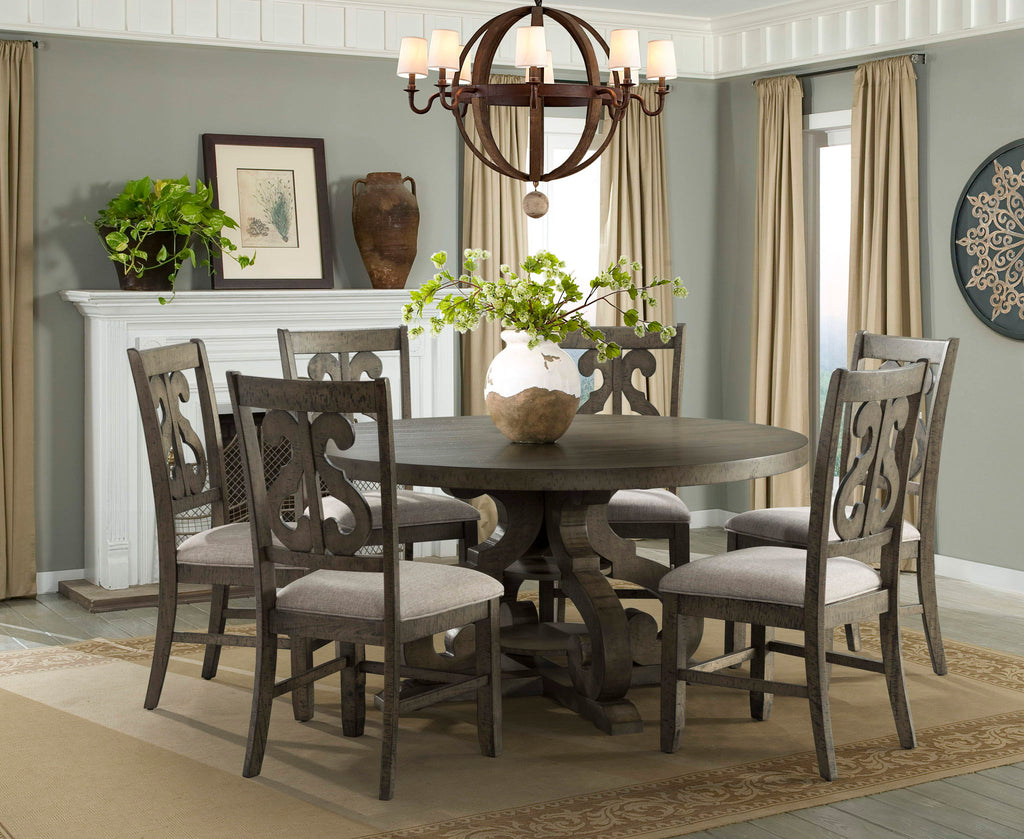 The Stone Round Dining Set is the ultimate gathering space! The round table features an intricate trestle base, an update to a classic design. The back of the side chairs is truly unique. An open, swirl back design on the chairs will be the reason you want to update your dining furniture. The chairs feature an upholstered seat, in a fabric. Perfect neutral color for any existing decor you have or as your taste in decor evolves. The foam filled cushion seat ensures comfort during those long sit down dinners. The entire set is finished in grey and features distressed markings throughout.