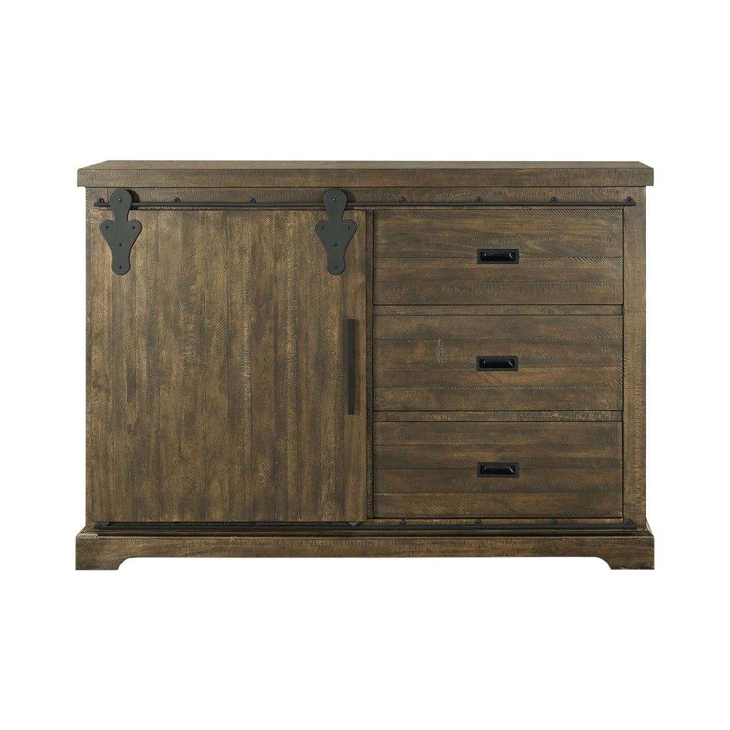 The Stone Server brings refined style and warm design to your dining area. Constructed of wood solids and veneers with a smoky finish, this piece offers three spacious drawers and a trendy sliding door. Decorative dark finished hardware completes the look of this handsome server.