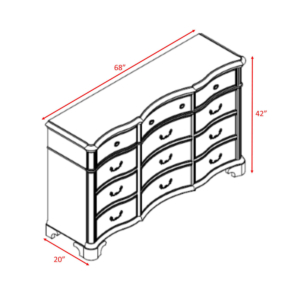 The Tabasco Dresser features stylishly curved drawer fronts and intricate moldings throughout. This gorgeous piece is accented with antique-styled hardware and luxurious faux woodgrain detail for both elegance and style. Twelve contoured drawers provide all the storage you could need while it’s top felt lined drawers will protect your more delicate items.