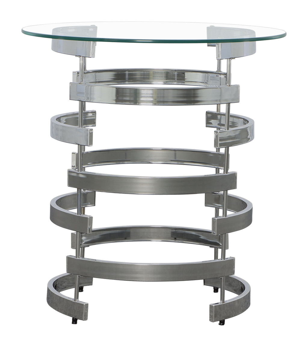 The Tayside End Table is one design that defines modern artistry. Crafted from chrome plated parts forming a sleek and exclusive looking base, the frame supports a 23 inch round top made of 8mm tempered glass that adds to the brightness of the room through its contemporary design. This reflects the philosophy of being refined and graceful, with the use of turnings, curved elements and simplistic elements to add the right amount of elegance to your living room.