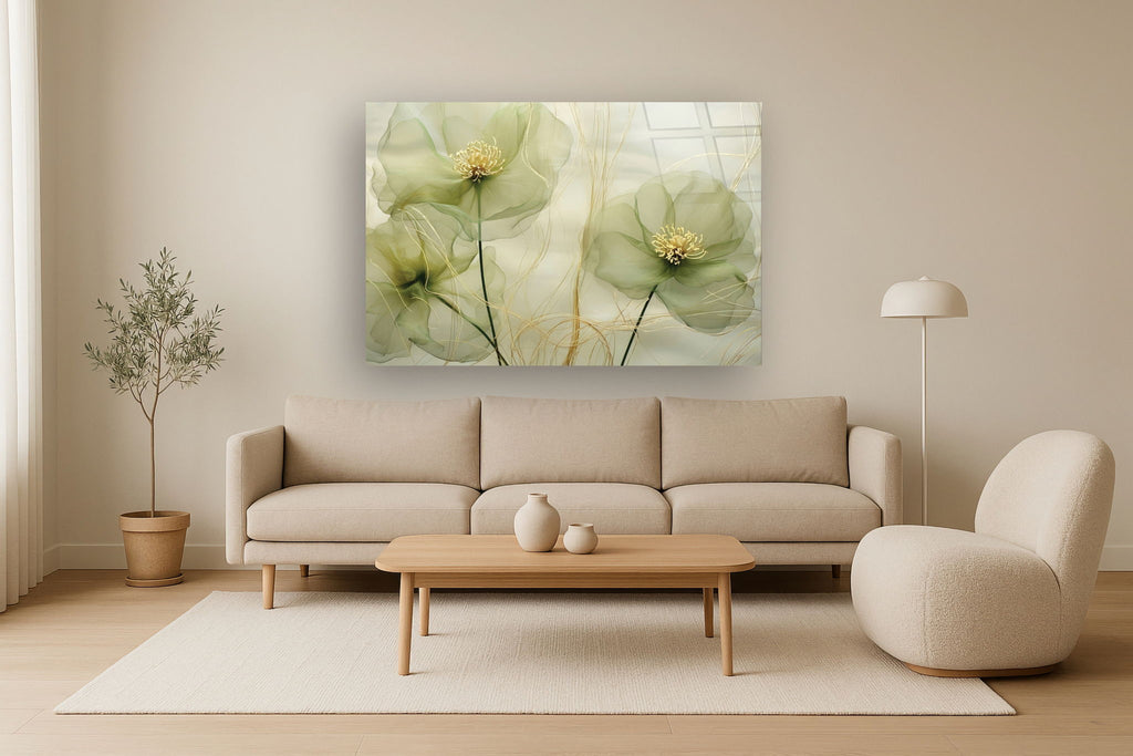 This "Green Whispy Floral Art" piece captures the delicate beauty of botanical forms with a contemporary twist. Printed and hand-embellished beneath durable tempered glass, the artwork offers a striking depth and shine that brings the subtle green petals and golden accents to life. Perfectly suited for living rooms, bedrooms, or offices, this frameless wall art is designed for easy hanging with angled sawtooth hangers, combining elegance with practicality. Each purchase also supports a meaningful cause by donating a meal to a hungry American child, making this piece not only a beautiful addition to your space but also a socially impactful one.