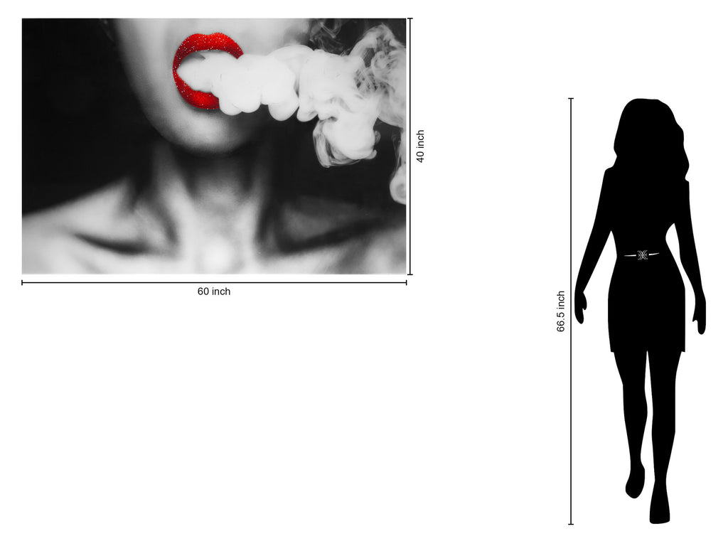 "Rolling Smoke Rhinestones" is a captivating contemporary wall art piece that combines photography with hand-embellished rhinestones for a striking effect. Printed beneath durable tempered glass, the artwork features a monochrome portrait with vivid red lips exhaling smoke, enhanced by sparkling rhinestones that add depth and shine. Ready to hang with angled sawtooth hangers, this sleek and dimensional piece brings a modern edge to living rooms, offices, or hospitality spaces. Each purchase supports a social cause by donating a meal to a hungry American child, blending impactful art with meaningful purpose.