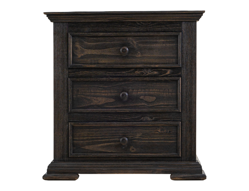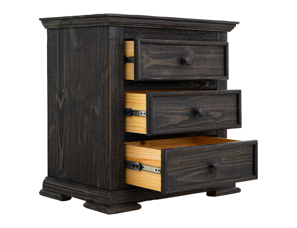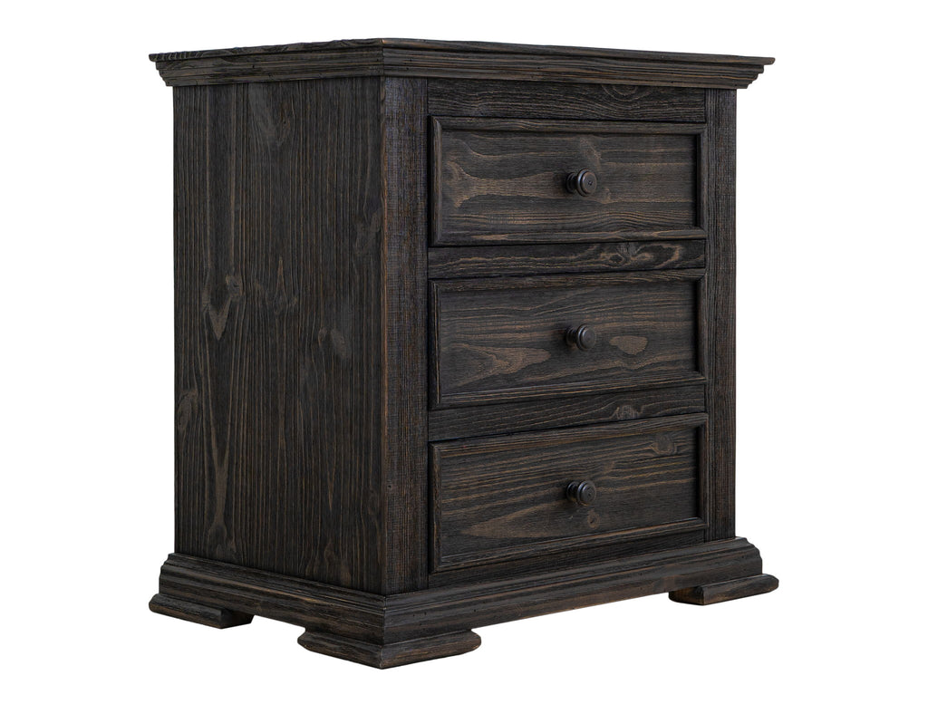 3 Drawer Nightstand. Drawing inspiration from transitional design, the Terra collection embodies the effortless elegance of its clean, sturdy shapes and the charming rustic grain of solid pine wood. With a tasteful deep finish, this collection represents a harmonious fusion of modern and traditional elements, making it a timeless addition to your home.