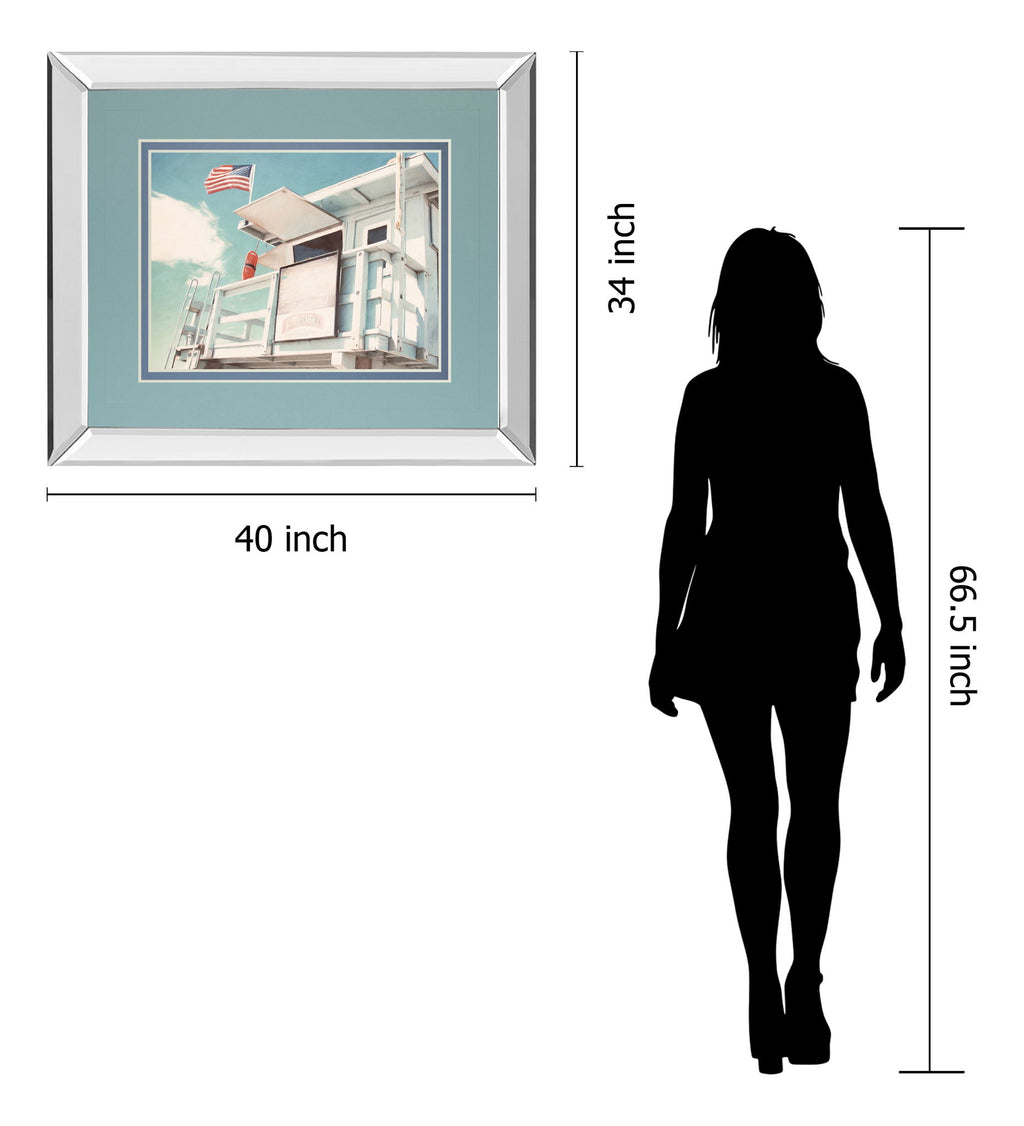 Step into a tranquil coastal scene with this captivating lifeguard tower artwork, where the gentle breeze flutters the American flag against a serene blue sky. The contemporary mirrored frame adds a sleek, reflective quality that enhances the artwork's depth and elegance, making it a standout piece in any living room, office, or beach house. Surrounded by double matting in soft blues and cream, this graphic art print offers a polished, gallery-style finish protected by premium real glass, effortlessly bringing a fresh, airy coastal vibe to your space with timeless sophistication.