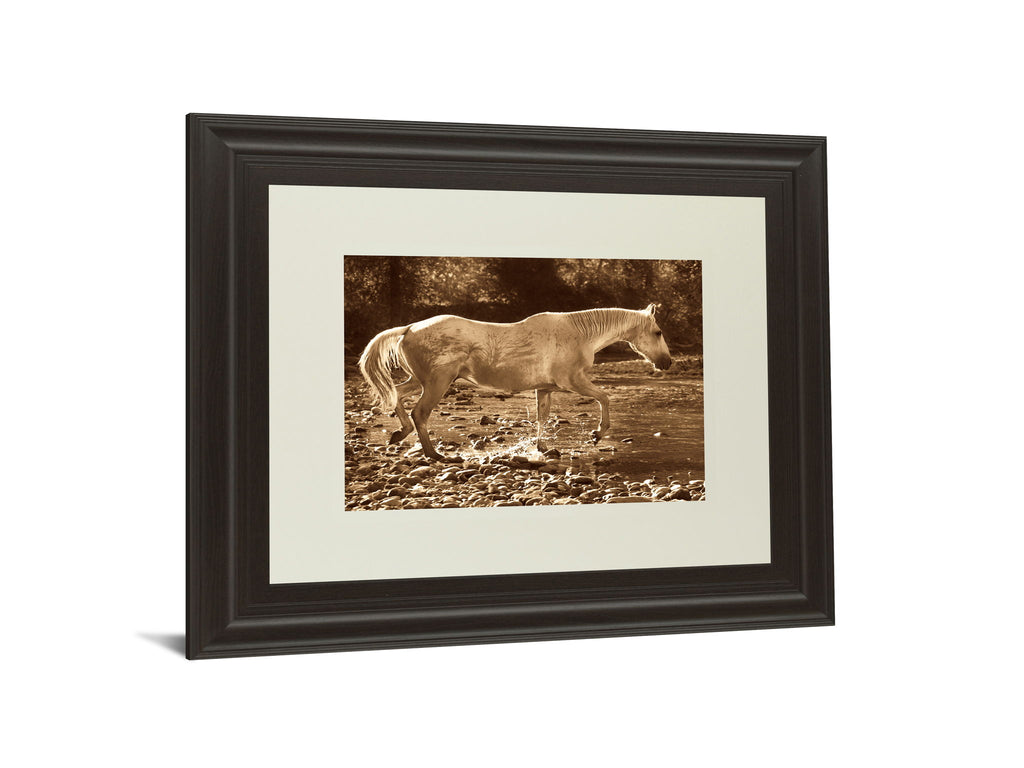Step into a tranquil moment where nature and grace converge in this captivating sepia-toned photograph. A horse gently crosses a shallow stream, its movement stirring the water and evoking a sense of calm and timeless beauty. Framed in a rich dark chocolate frame with cream double matting and premium real glass, this piece adds a sophisticated touch to any living room, office, or study. The warm hues and natural charm invite you to pause and appreciate the quiet elegance of the outdoors, making it a serene focal point in your space.