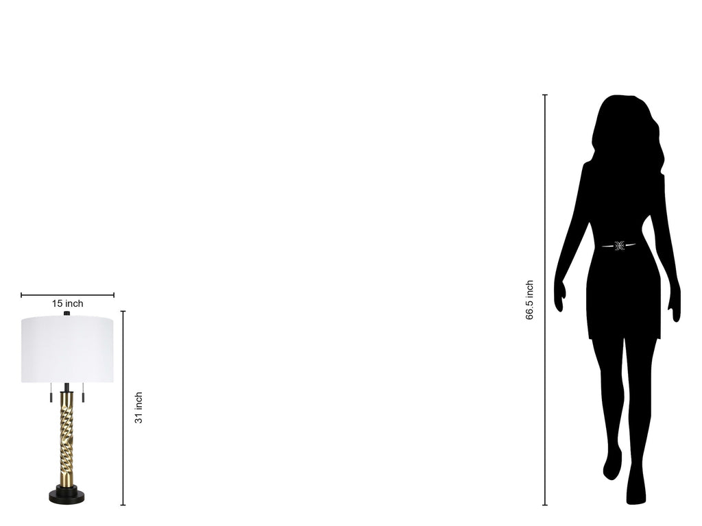 The Twist Elegance table lamp brings a touch of modern sophistication to your home. Its striking twisted column design in soft gold and black creates a captivating focal point, while the white linen drum shade casts a warm, inviting glow. Ideal for nightstands or living room consoles, this lamp set offers both style and functionality with its double pull chain switches.