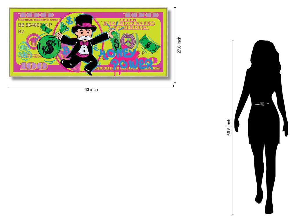 This vibrant "Money Power Mixed Media Art" piece is a contemporary celebration of wealth and influence, blending playful imagery with bold colors and textures. Featuring a charismatic figure holding cash against a striking backdrop of stylized currency and graffiti-like accents, this artwork captures the energy and allure of financial power. Hand-embellished with foil and textured rocks on a durable canvas base, it offers a glossy finish that enhances its vivid details. Perfect for youth rooms or modern living spaces, it arrives framed and ready to display, making a dynamic statement wherever it is placed.