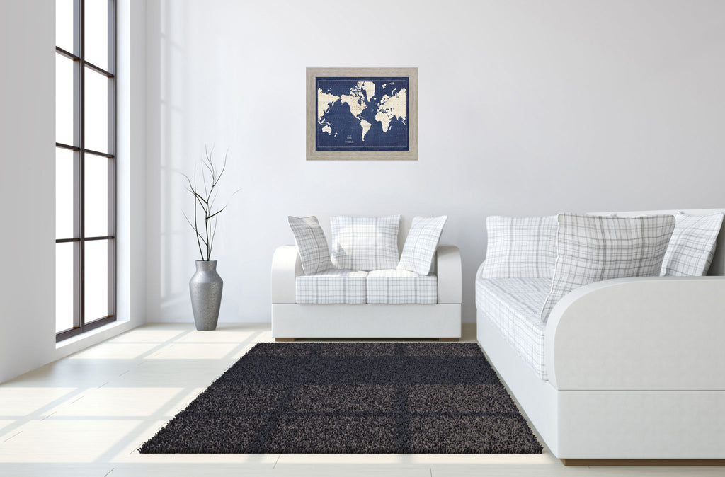 Step into a world of timeless elegance with this Blueprint Map, a captivating piece that transforms any room into a space of discovery and style. Featuring a detailed world map in classic ivory and deep navy blue hues, it is framed with a 3-inch wide ivory bliss finish that adds a subtle yet striking contrast. Crafted with premium materials including real glass and durable MDF, this framed wall art offers vibrant colors and lasting clarity. Perfectly suited for living rooms, offices, or studies, it brings an industrial charm that complements both modern and vintage decor. Ready to hang and proudly made in the USA, this map invites you to explore the beauty of the world from the comfort of your home.