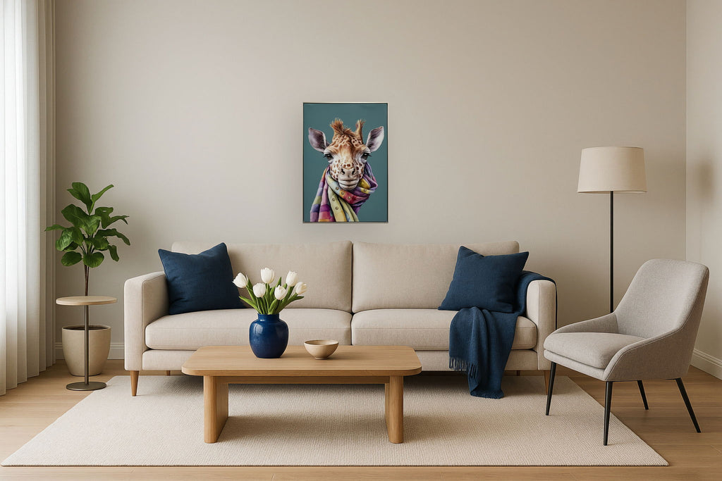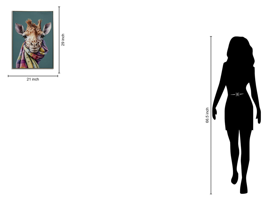 This captivating "Giraffe with Vibrant Scarf Canvas Art" brings a playful yet sophisticated charm to any space. Featuring a beautifully detailed giraffe adorned with a colorful, hand-embellished scarf set against a rich teal background, this piece combines artistic craftsmanship with contemporary style. The gloss-coated canvas enhances the vivid colors and textures, while the champagne silver frame adds a subtle elegance. Perfectly suited for living rooms, bedrooms, or offices, this framed graphic art arrives ready to hang and instantly enlivens your decor with a touch of whimsy and warmth.